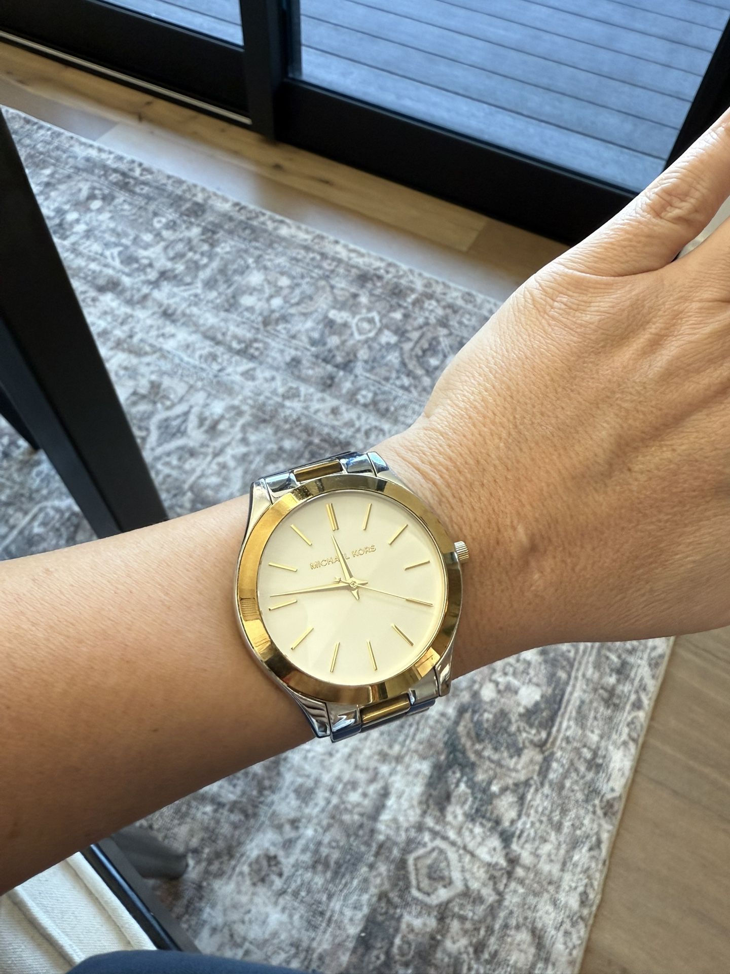**Needs a new battery since the one inside is dead.** Two toned Michael Kors women’s watch with a white dial. Currently fits a 6-6.25inch round wrist but I do have the extra links if you need it bigger. Model number 3198. Made out of all stainless steel. Pick up only.