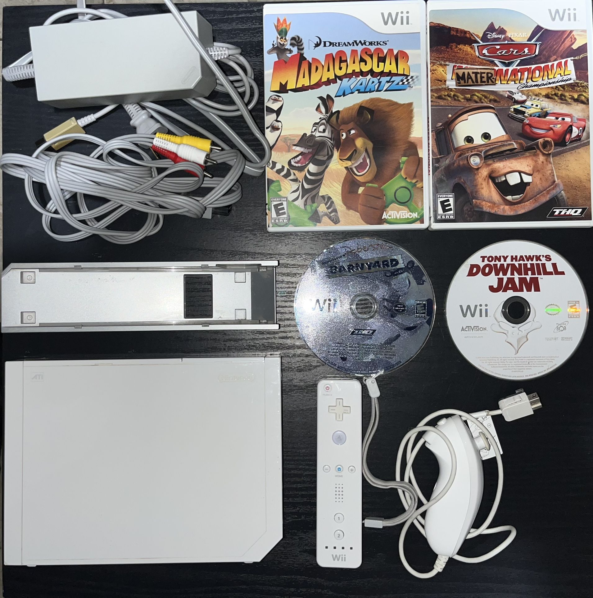 Nintendo Wii (GameCube Compatible) Includes: Console 1 Controller 1 Nunchuck Console Stand Power Cable AV Cable Sensor Bar Game- Madagascar Kartz Game- Cars Mater National Game- Barnyard Game- Tony Hawk’s Downhill Jam Asking $75