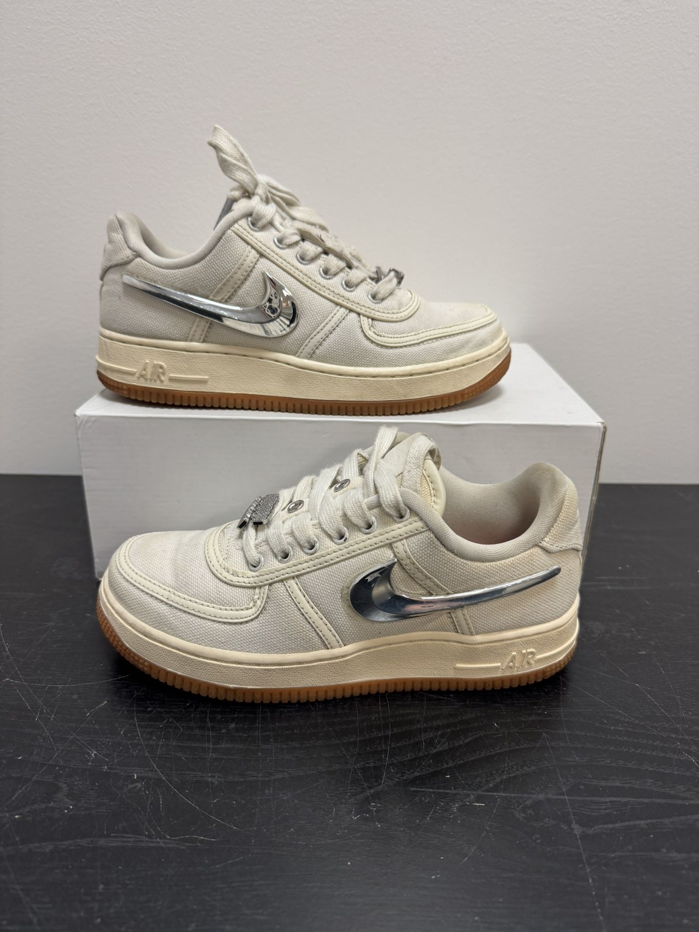 Name: Air Force 1 Travis Scott Sail Size: 4.5 Box: yes Condition: stained, missing toung patch all swoosh’s included 100% authentic. Check out my profile for more items. If you would like more information, please message me. I am open to negotiate prices, bundles, etc. I will ship within 24 hours (week days only) No returns