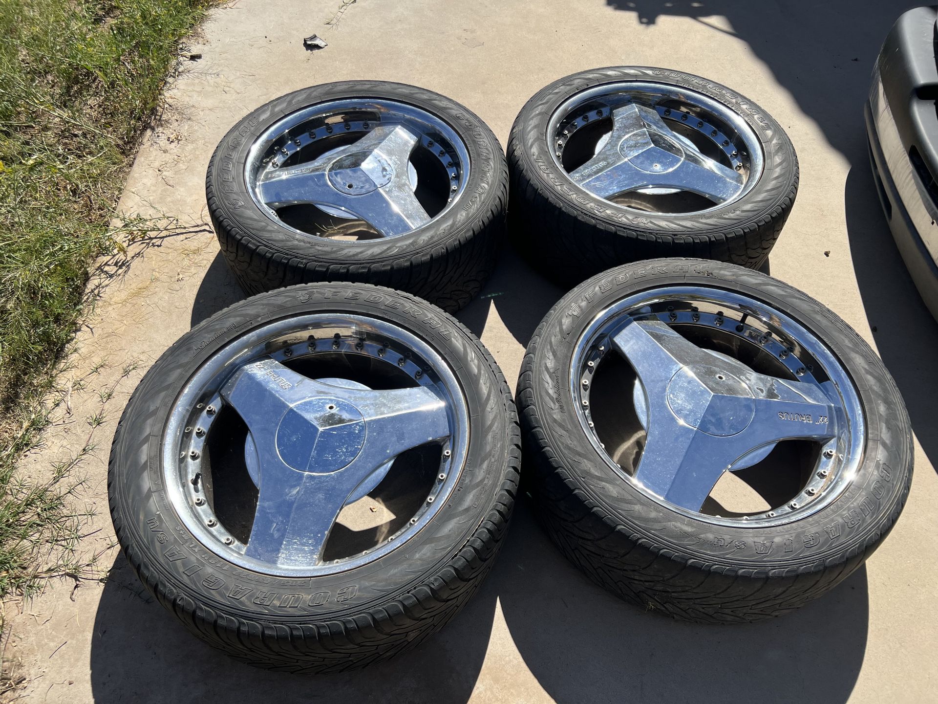 22” Brutus Blades Tri spoke 305/45r22 Tires all hold air but I would replace them Center caps included Chevy 6 lug pattern 6x5.5 For Sale Wheels for Sale Rims for Sale Tires for Sale Custom Wheels Aftermarket Wheels Chevy Wheels 24 Inch Wheels 24s Big Rims Truck Wheels SUV Wheels Wheel Deal Car Parts for Sale Auto Accessories Chevrolet Chevy Truck Chevy Tahoe Chevy Silverado Silverado Tahoe Life Suburban GMC Yukon Denali GM Trucks Staggered Setup Gloss Black Wheels Chrome Wheels Forgiato Style Dub Wheels Lifted Truck Street Truck Show Truck Clean Truck Custom Build