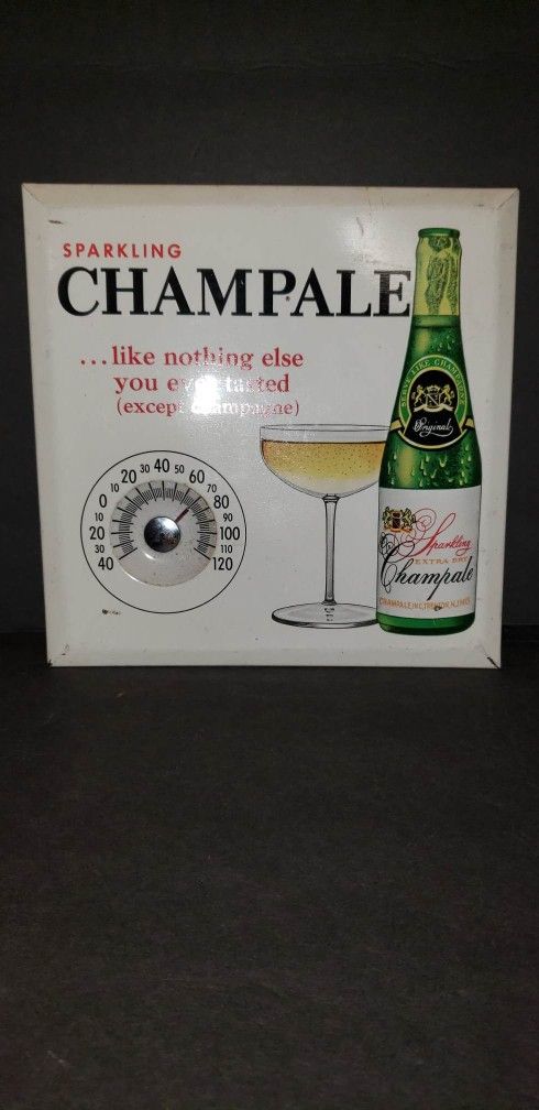 Vintage Sparkling CHAMPALE Tin Over Cardboard Advertising Thermometer. Working thermometer, in well kept condition. May show nicks/ dings / paint loss from scratches and such- all from being displayed or stored away. See all photos. Cord in back to hang to a wall still, marked Permanent Sign and Display Co. on back. Great piece to gift or for the mancave / barroom About 8.75" x 8.75" $90 / Lorain pickup or Shipping Available