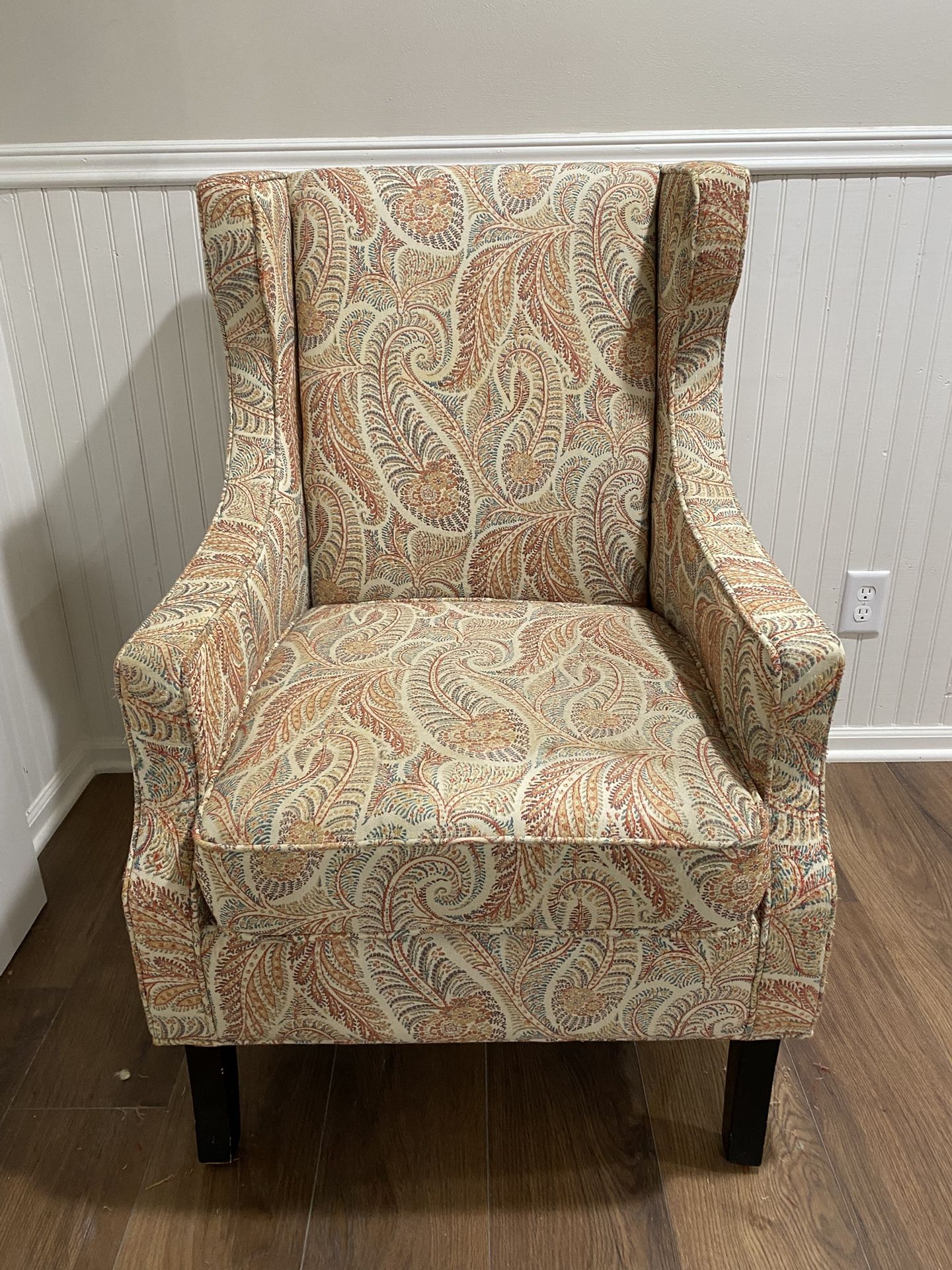 Comfortable arm chair with paisley pattern. Beautiful. Has some minor fraying along the side. Wanted to keep it but it no longer matches my new decor.