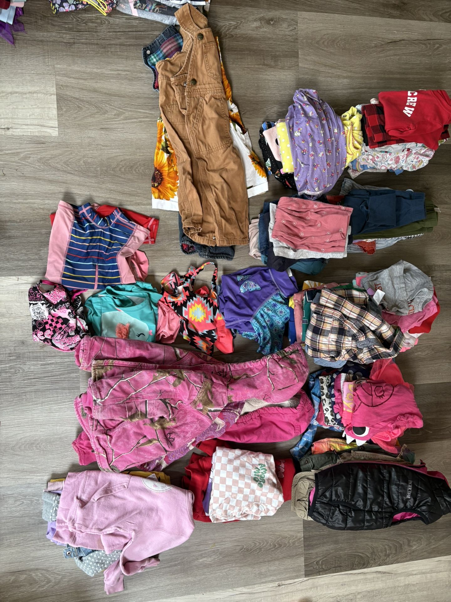Five swimsuits Three pairs of overalls 10 pairs of pajamas (onesies or matching sets) five pajama shirts 12 pairs of leggings One pair of jeans Two pairs of shorts Six tank tops Three long sleeve shirts One flannel shirt Six dresses One skirt Two vests Nine sweatshirts One raincoat, two Carhartt jackets,2 light jackets.