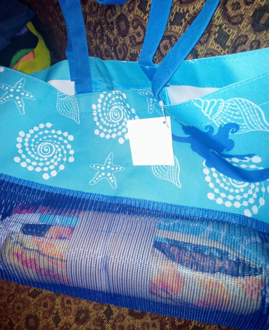 This wonderful tote is perfect for a beach outing. It includes a Moana Beach Blanket. The tote has an inside pocket. It measures approximately 13" high, 22" long, with a 5 1/5" bottom. The bottom half of the bag is made of mesh and the top half is canvas with a beach motif. Makes a great gift for anyone!