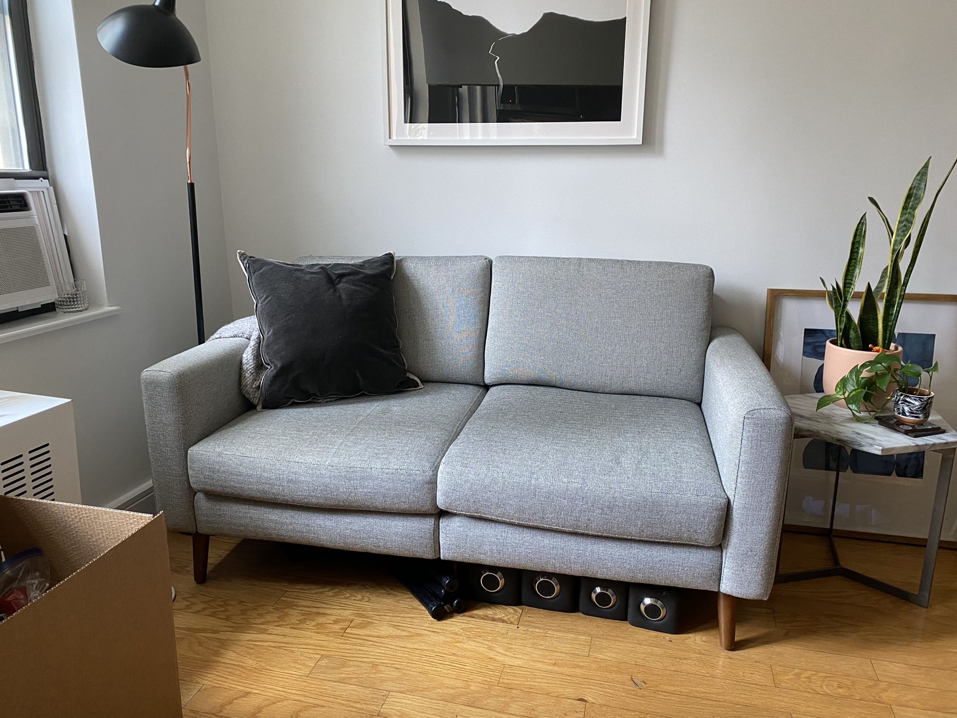 Burrow Nomad Couch Block Arms Gray Fabric Walnut Legs Used for less than a year Bought this loveseat in July 2021 and it’s been gently used by me and my small pup. I’m moving and will be replacing it with a bigger couch - so this can be yours for a bargain! Pick up in Brooklyn Heights (Clark and Henry Sts.). Elevator in building. Easy to disassemble and reassemble - comes in 3 pieces and 4 cushions.