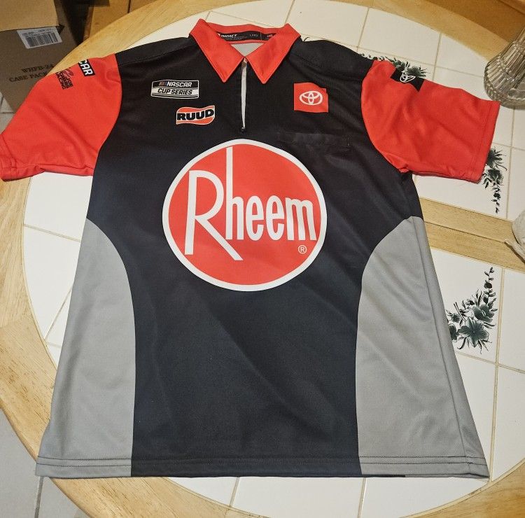 The "Official Christopher Bell No. 20 1/4 Zip Rheem Pit Crew Jersey" is a licensed NASCAR apparel item featuring the branding of driver Christopher Bell and sponsor Rheem. This size large jersey is designed as part of a pit crew uniform, with a 1/4 zip style for easy wear during racing events. Made in a jersey style, it is likely designed for comfort and breathability during high-energy activities. This item is a must-have for fans of Christopher Bell and NASCAR looking to show their support in style