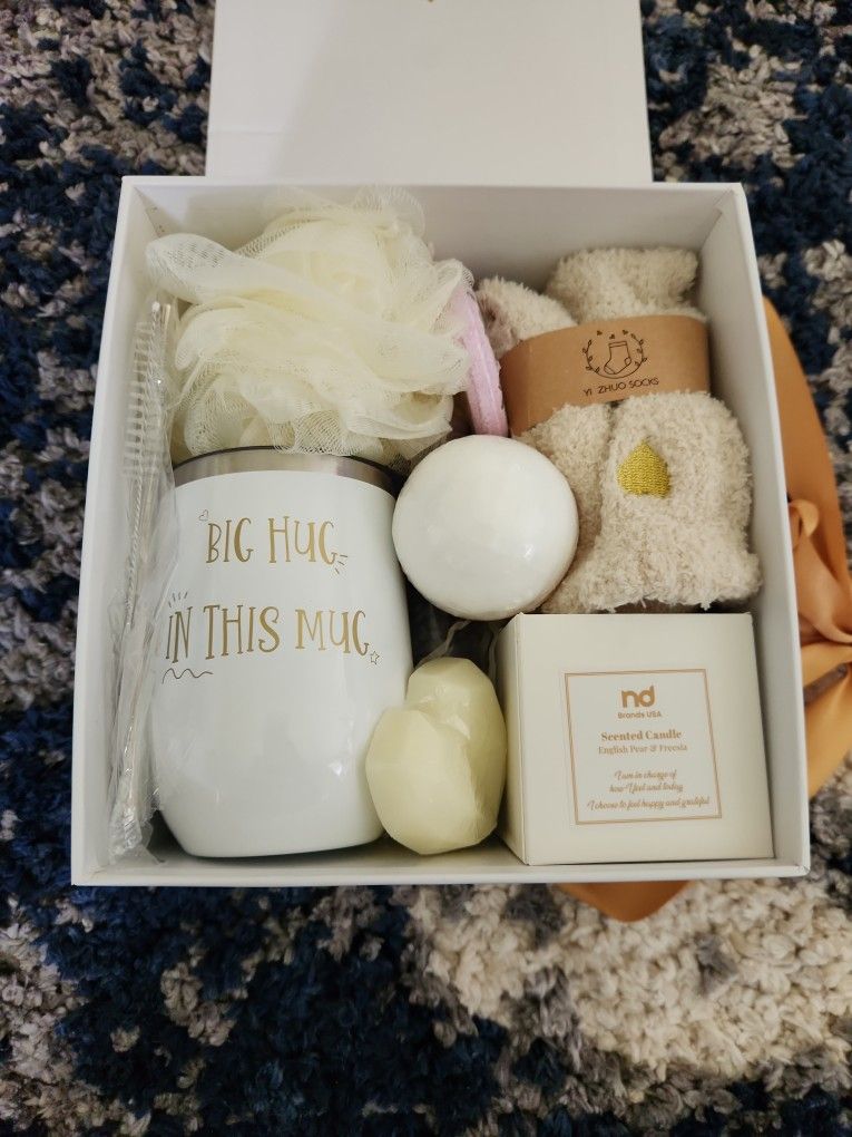 Includes Stainless steel mug Cozy socks Soap Candle And more