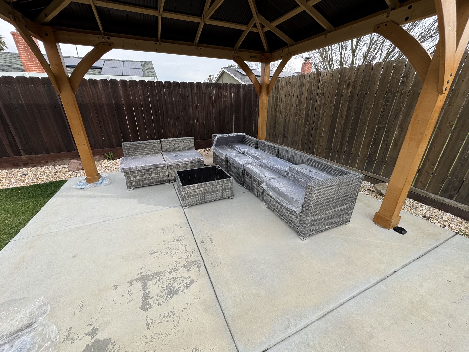 Put together but never used, pillows still in packaging. Selling to buy larger set. Goes for $500 new. 7 Piece Outdoor Patio Furniture Set, PE Rattan Wicker Sectional Sofa Set with Couch Cushions, Pillows, Black Coffee Table, Double Gray. 30 inch width, 25 inch height . You haul