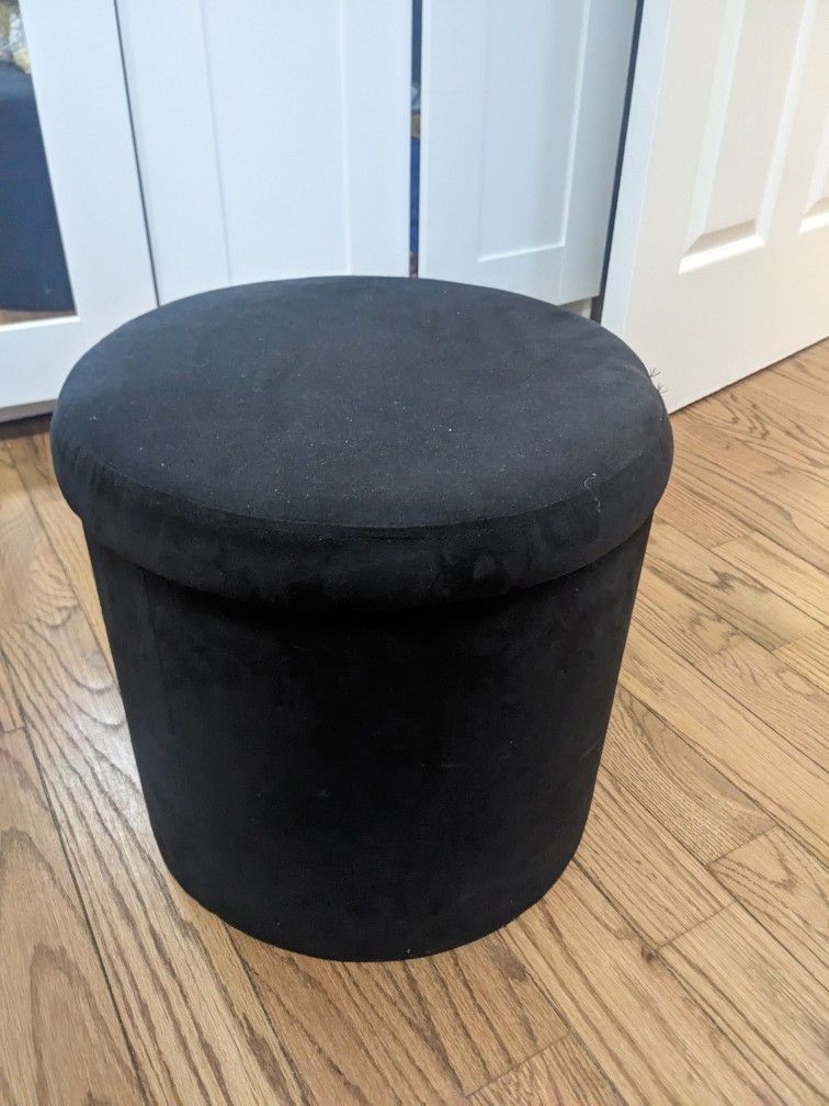 Round black storage ottoman with reversible top that can be used as a table. Good for storage (small pillows, blankets, toys, toiletries, hair products, board games, etc.). Provides additional seating. Good for use in bedroom, living room, dorm room and small spaces. 14 inch diameter and 14 inch height Pick up and cash only please.