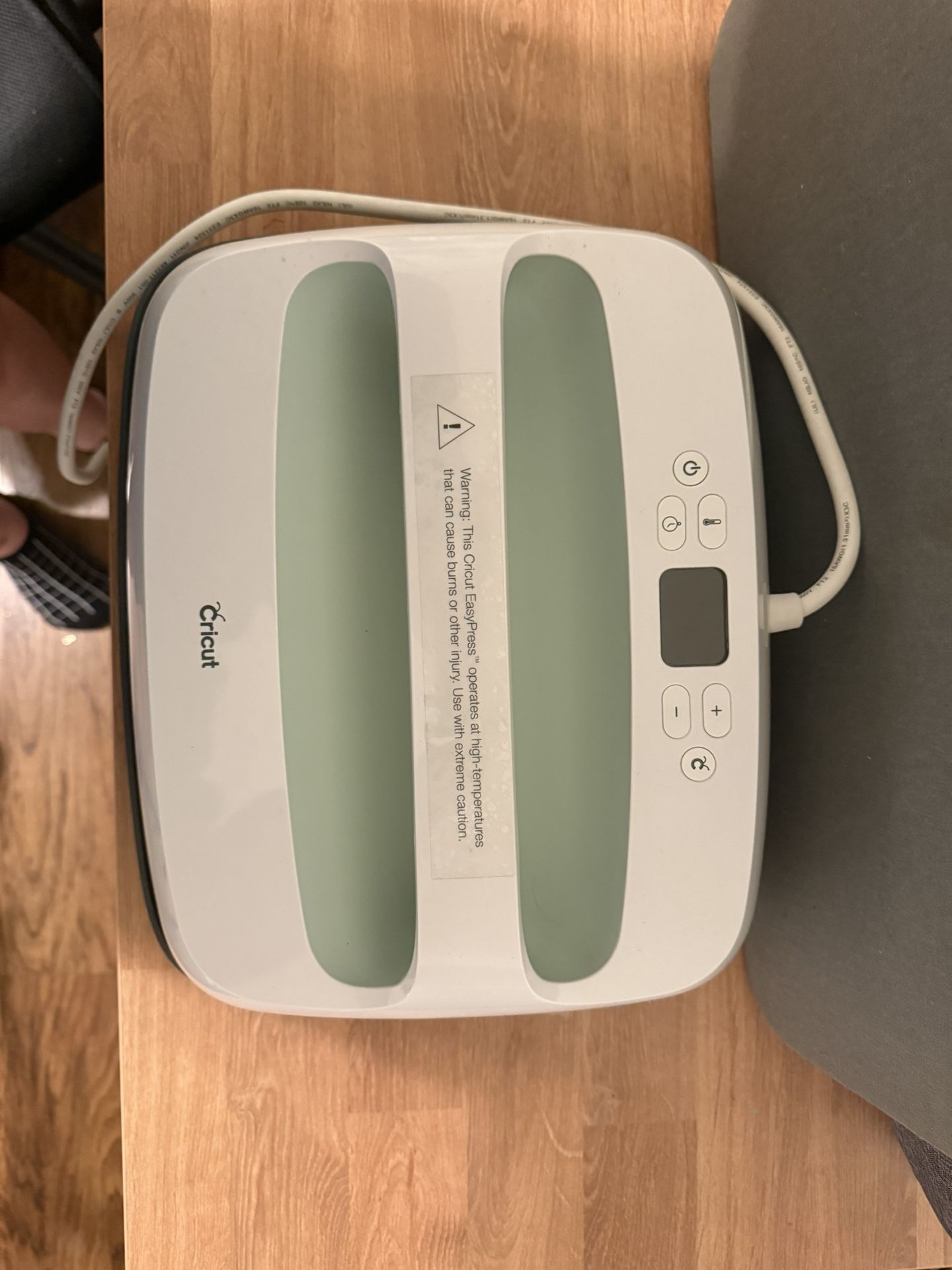 Cricut Easy Press with heat plate, dust cover and an off brand heat pad with a few burn marks. I purchased the easy press from HSN for over $250+ a year ago and only used it twice but couldn’t get the hang of it.