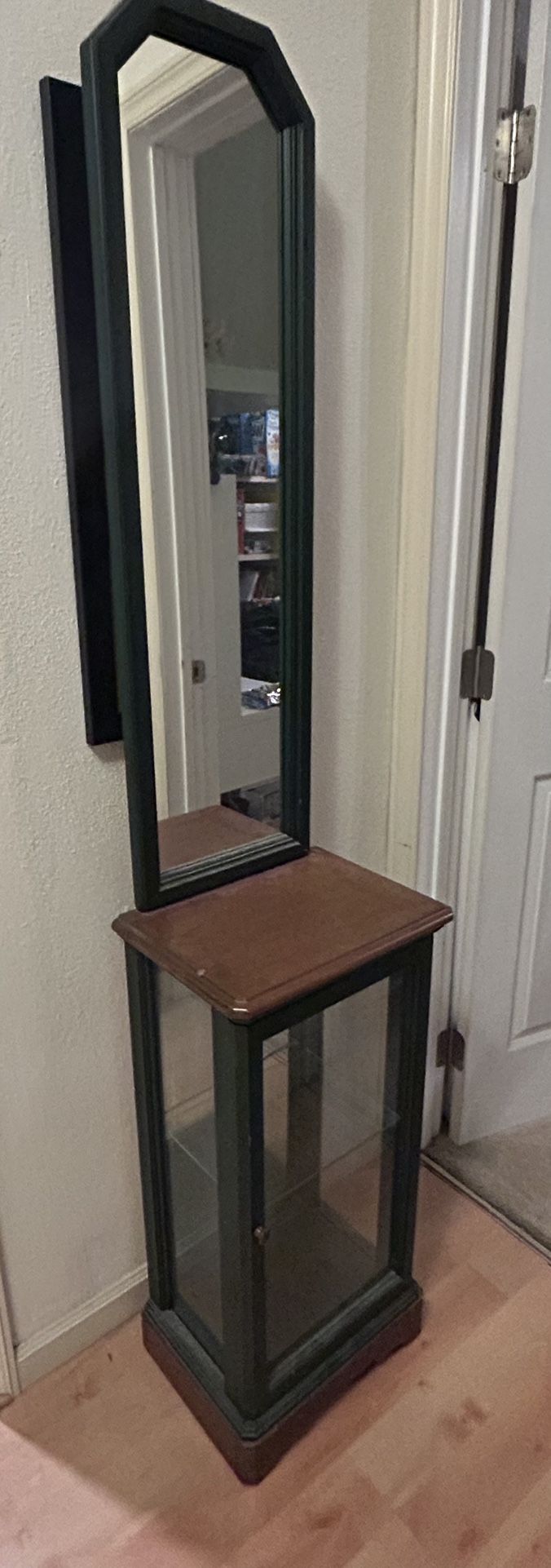 Small entry way hutch with mirror….6f tall, 15” wide and 11” deep. It dis have cord so lower part of cabinet it will light up…