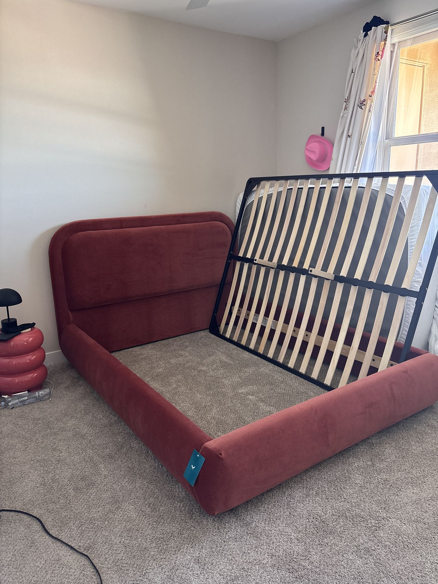 Frame Bench assembled engineered wood frame reinforced with corner blocking and kiln dried solid wood spring rails to prevent warping. Base Slatted Platforms, no box spring required. Slat 30 slats with 2.5" spacing between slats Shipping Components Head board, 2 side rails and 1 foot rail Assembly required Railing Height 14" Floor Clearance 1.5" Mattress and pillows not included. Size Variance Dimensions of bench-made upholstery may vary slightly. Originally $2,559 Perfect condition was delivered 2 weeks ago, I just need to size down to a full now that I’m moving.