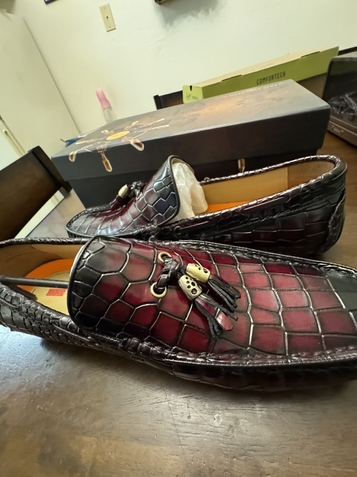 New! Bold red & black crocodile-pattern loafers with gold tassel accents. Stylish, comfortable, and includes original box. Perfect for dressy or casual looks. Pickup only. Cash or Zelle