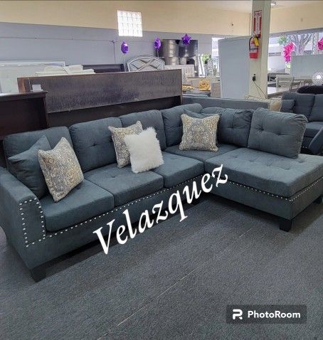 ✅️2 pc Grey linen like fabric sectional sofa with chaise and nail head trim. This set includes the 2 pc sofa with chaise sectional throw pillows. This sectional is in linen like fabric. Sectional measures 99" across the back, Chaise comes out 66" and each piece is 33" Deep and 35" H. This set is KD✅️$272 + sale tax $300 cash only ✅️ this promotion is just pick up ✅️ only delivery is not available ✅️