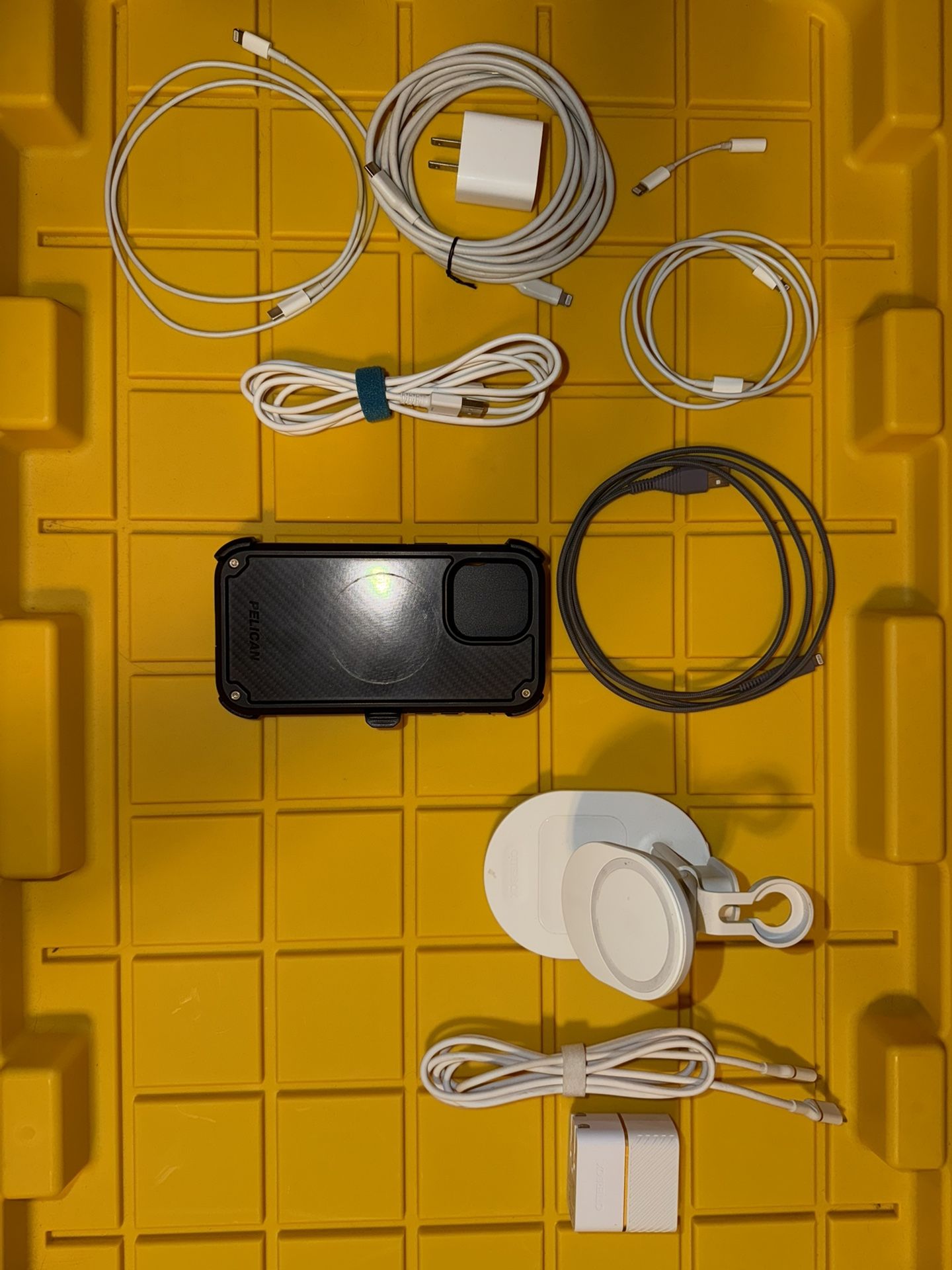 Selling as a lot and not taking trades OtterBox MagSafe charging dock for iPhone, AirPods and Apple Watch *doesn’t come with watch charging cable* Pelican Shield Carbon Fiber case for iPhone 14 ProMax Apple fast charger with 10ft cable Multiple usb-c to lightning and usb-a to lightning charging cables Aux cable to lightning adapter