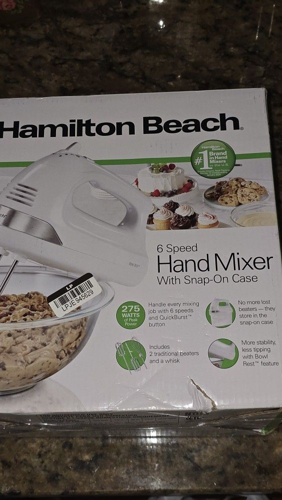 NO MORE LOST BEATERS: The snap-on storage case that comes with the Hamilton Beach hand mixer neatly holds the 2 beaters and whisk in one easy-to-find place, reducing the chance that the attachments are lost or misplaced. EASILY HANDLES A VARIETY OF RECIPES: With 6 different speed options plus a QuickBurst button for an extra burst of power when you need it, this electric hand mixer prepares every recipe with ease. EVERYTHING YOU NEED TO START MIXING: This hand mixer comes with 2 traditional beaters and a whisk that are dishwasher safe. After mixing, simply press the speed dial to eject the attachments from the mixer without getting your hands messy. POWERFUL MIXING PERFORMANCE: The 250 watt peak-power motor provides all the power you need for every mixing job, whether you're adding chocolate chips and nuts to cookie dough or making fluffy whipped cream. MORE STABILITY, LESS TIPPING: The Bowl Rest feature frees your hands by stabilizing the kitchen hand mixer on the edge of the bowl, so drips end up in the bowl and not on your countertop.