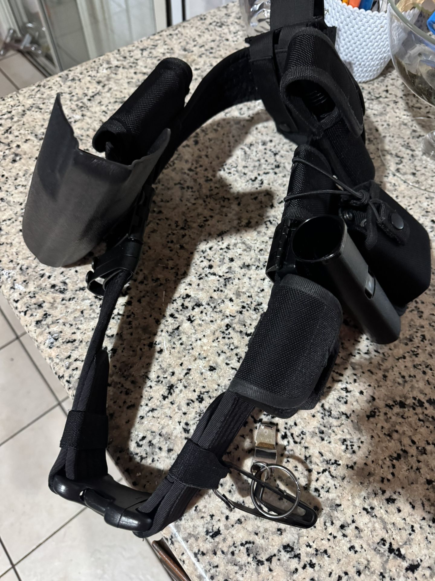 Nylon duty belt with (baton holder, radio holder,glove pouch, mk9 holder, grenade pouch, flash light pouch, alarm pouch, and 4 belt clippers) size 32-36.