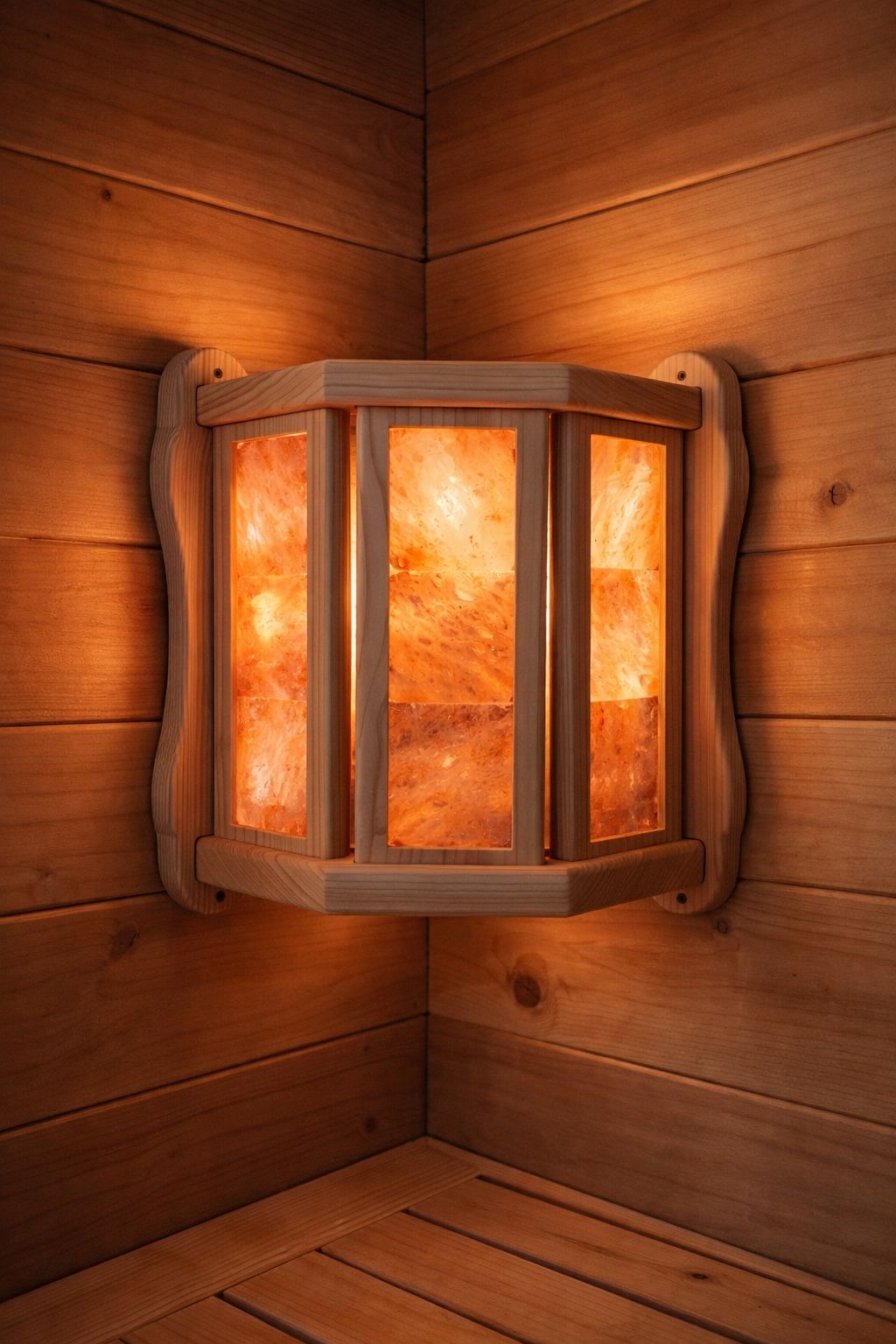 Description This handcrafted corner sauna lamp / lampshade is designed specifically for dry sauna use. The fixture is made from solid natural cedar and features genuine Himalayan salt panels installed inside the frame. When illuminated, the salt diffuses light into a warm, soft amber glow that enhances the traditional sauna atmosphere. This is a corner-mounted sauna shade that covers a light source and creates a comfortable, non-harsh lighting environment. Perfect for Finnish sauna, traditional dry sauna rooms, and wellness spaces. Designed For • Dry sauna use only • Indoor sauna installation • Corner wall mounting • Traditional wood sauna interiors ⚠️ Not intended for steam rooms with direct water exposure. Materials • Solid Cedar wood (unfinished) • Natural Himalayan salt panels • No paint • No stain • No oil treatment Wood is intentionally left untreated for safe use in high-temperature dry sauna environments. Dimensions (Approx.) • Width: 15in • Height: 13 in Weight • 5 lb 60 oz (approx. 2.56 kg) Solid and substantial construction — not lightweight décor. Features • Corner design — space efficient • Soft warm ambient lighting effect • Traditional sauna aesthetic • Durable cedar construction • Natural mineral salt insert • Handcrafted build Safety & Use Notice • Dry sauna use only • Do not pour water directly on fixture • Do not drop or impact • Not a toy — keep away from children • Do not stand, sit, or place weight on product • Do not apply oils, varnish, or coatings Normal dry sauna heat is safe. Direct water exposure is not recommended.