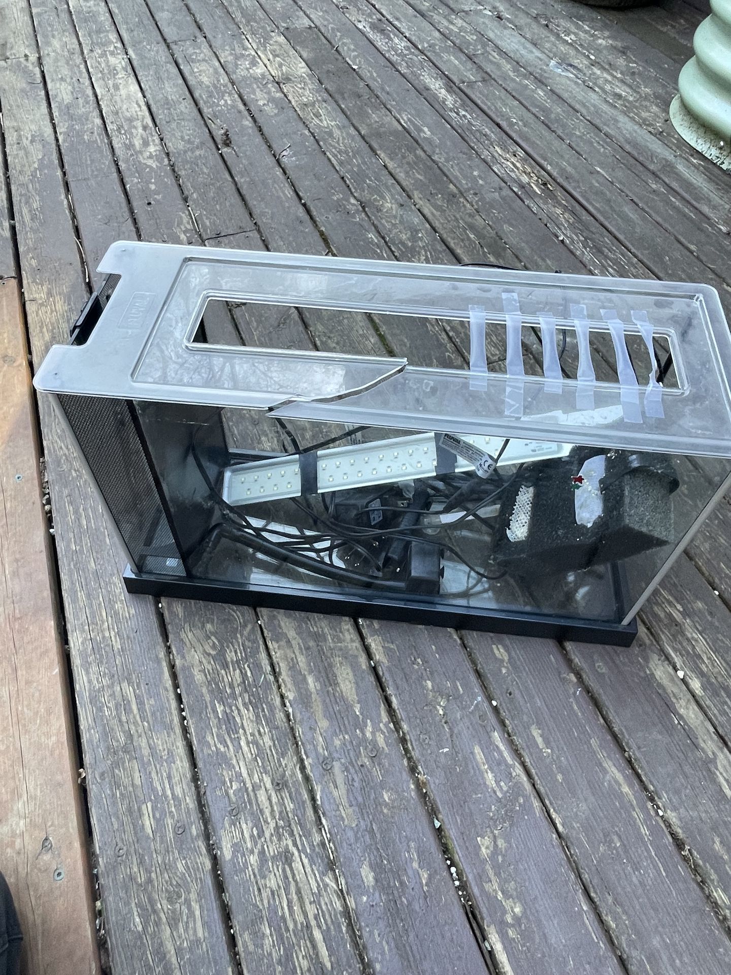 Free fish tank. Has a pump, filters, few accessories not shown, like scrubber and some bed material. Everything you need to get started other than fish and some decorations. We had our fun with it now ready for a new home.