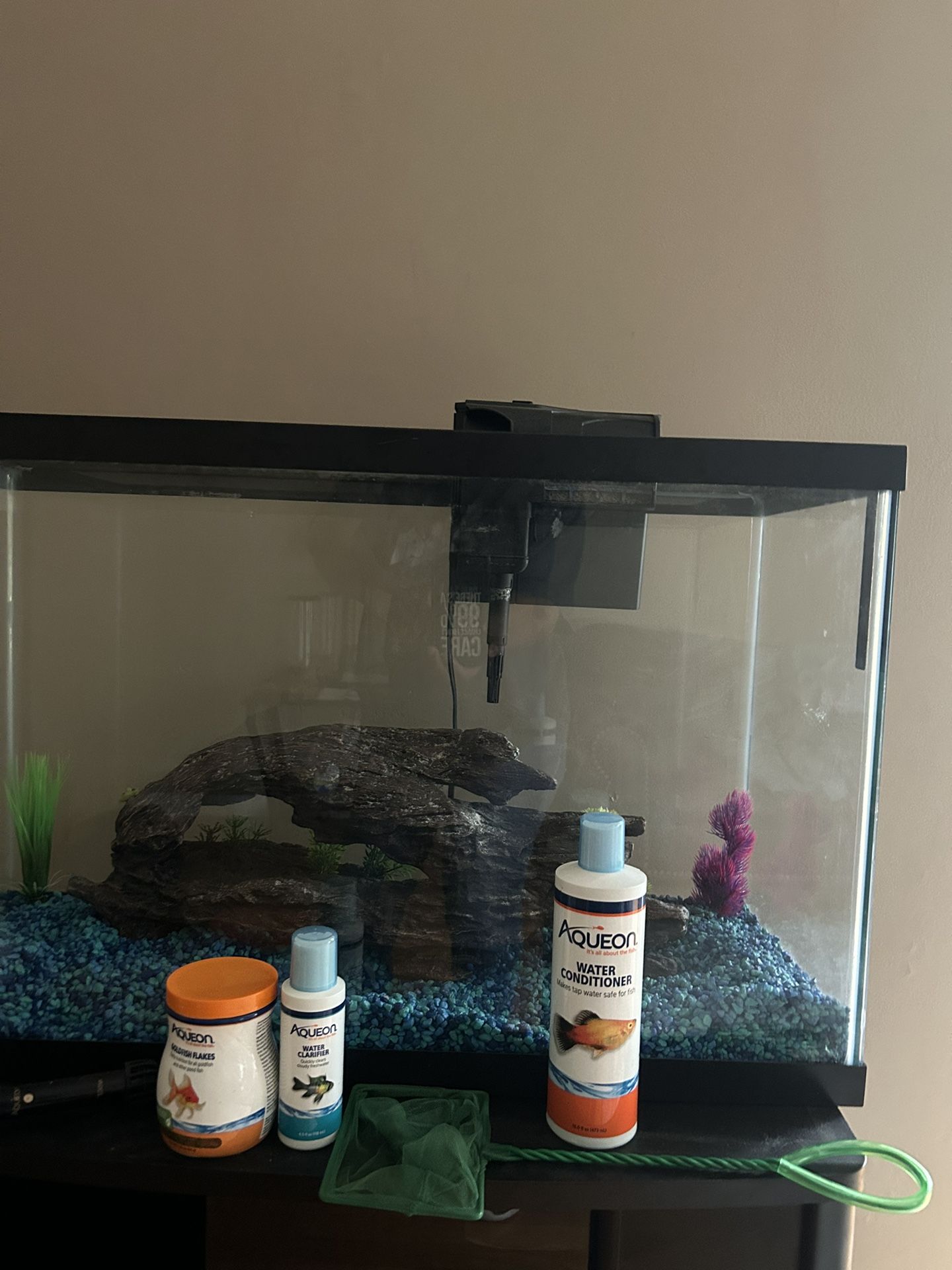 30 gallon fish tank comes with filter and heater There are also a few decorations, net, water conditioner, fish food and water clarifier. Must have someone to carry fish tank.
