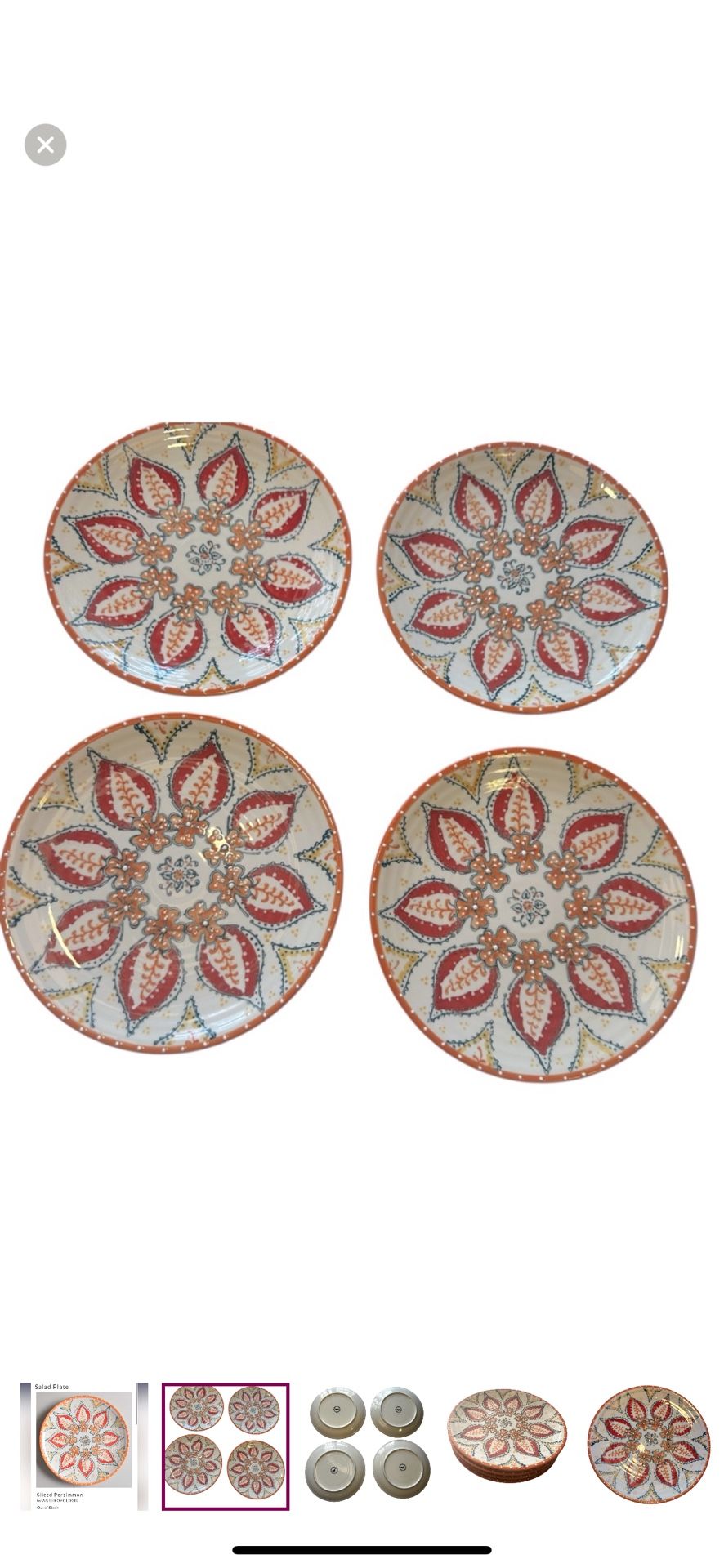 Anthropologie painted sliced persimmon salad plates Matching Set of 4 Size 8" Diameter x 7/8" Height Colors Red/Orange/ Yellow White Beautiful salad plate with a Mediterranean design in Anthropologies' sliced persimmons pattern with raised white dots. Stoneware Dishwasher and microwave safe Excellent condition RARE retired item