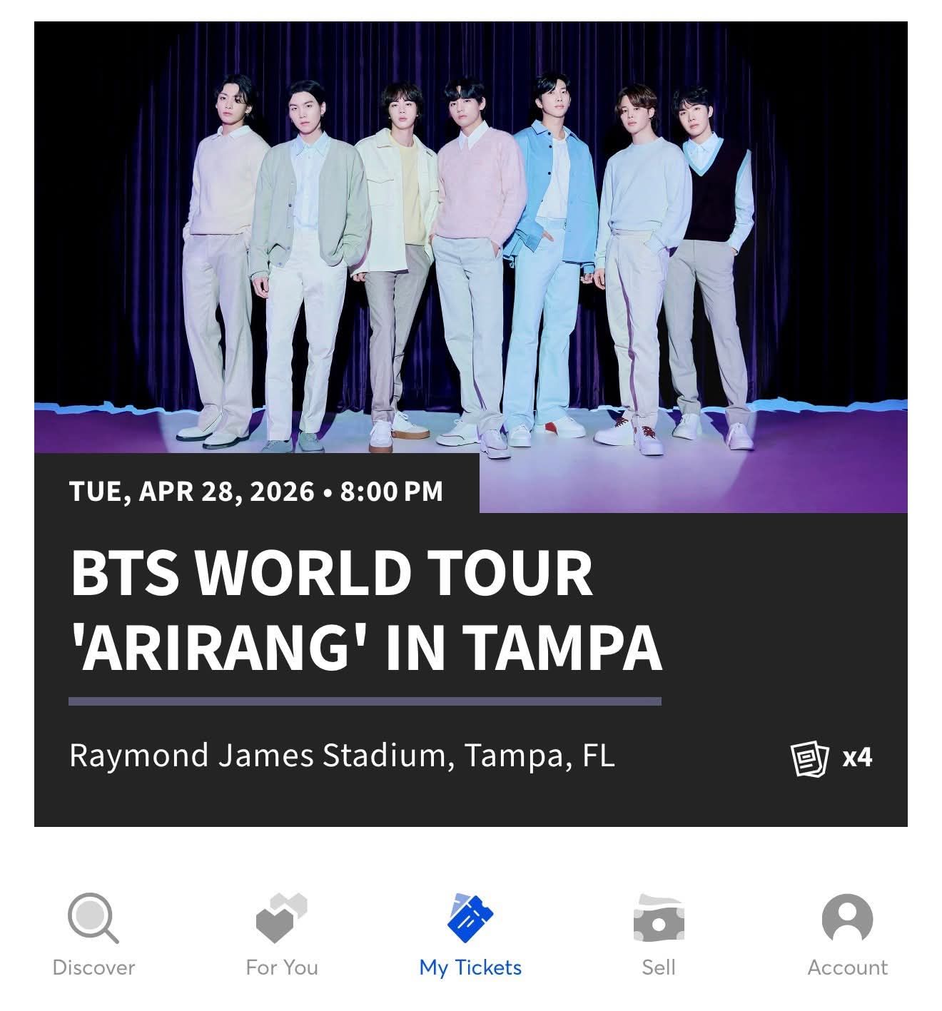 4 BTS TAMPA TICKETS Middle section of the stage Section 236 row K seat 5,6,7,8 Can provide proof of ticket ownership Can transfer ticket immediately $280 each Accept Zelle or Paypal G&S only if buyer pay fee