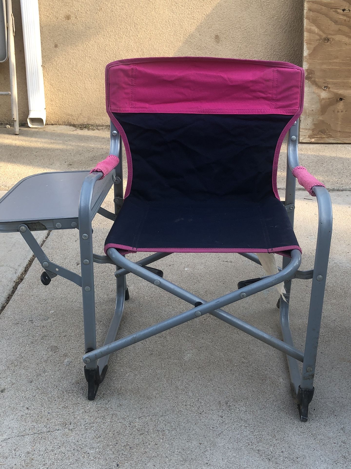 Director style chair with side table. For small kids. Will need a cleaning from sitting in the garage. The table has scuffs. Fold flat for easy storage. (Pink)