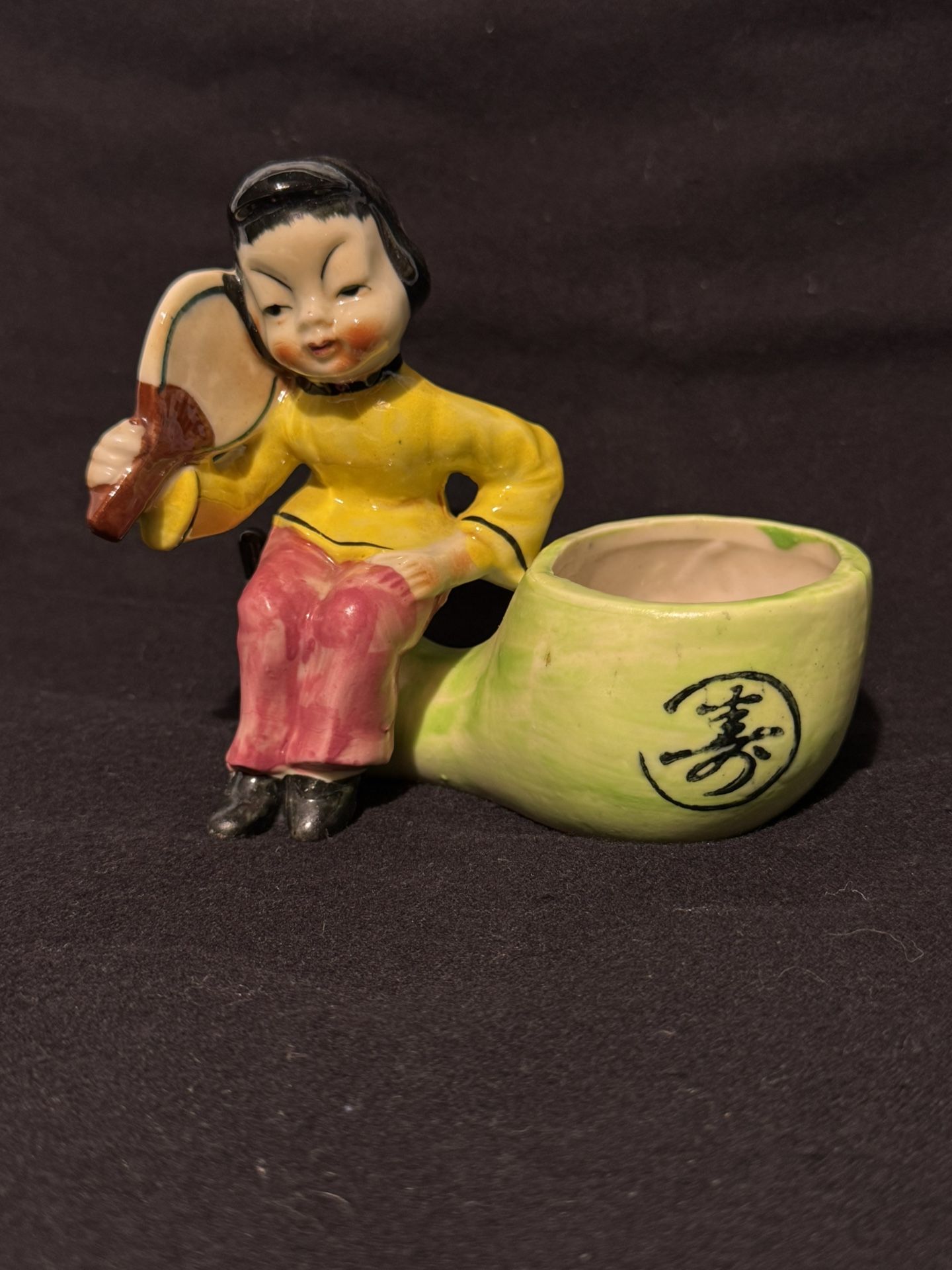 VINTAGE 1940'S-1950'S CHINESE STYLE PLANT POTTERY Oriental Asian Planter - perfect for a couple of air plants or succulents or to use as toothpick holders. The little figure is perched on pear-shaped base- She has the calligraphic symbol for Longevity. Made in Occupied Japan, it dates to 1(contact info removed). Imported by Rosetti of Chicago. Perfect vintage condition. No chips, cracks or repairs. Colors are rich and deep. They measure approximately 4.5" tall x 4.25" wide.
