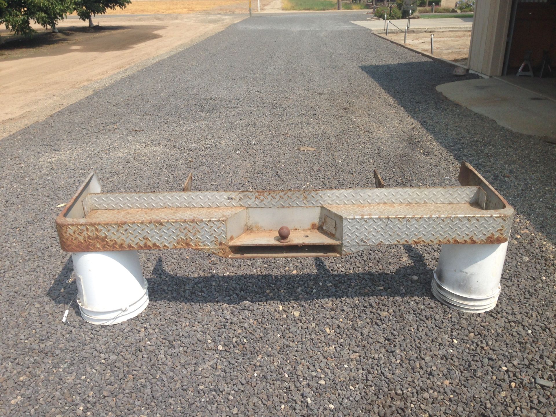 34 inches between brackets where it mounts to frame. 741/2 inches where it wraps around truck bed. Came off of a 1959 Chevy fleet side bed.