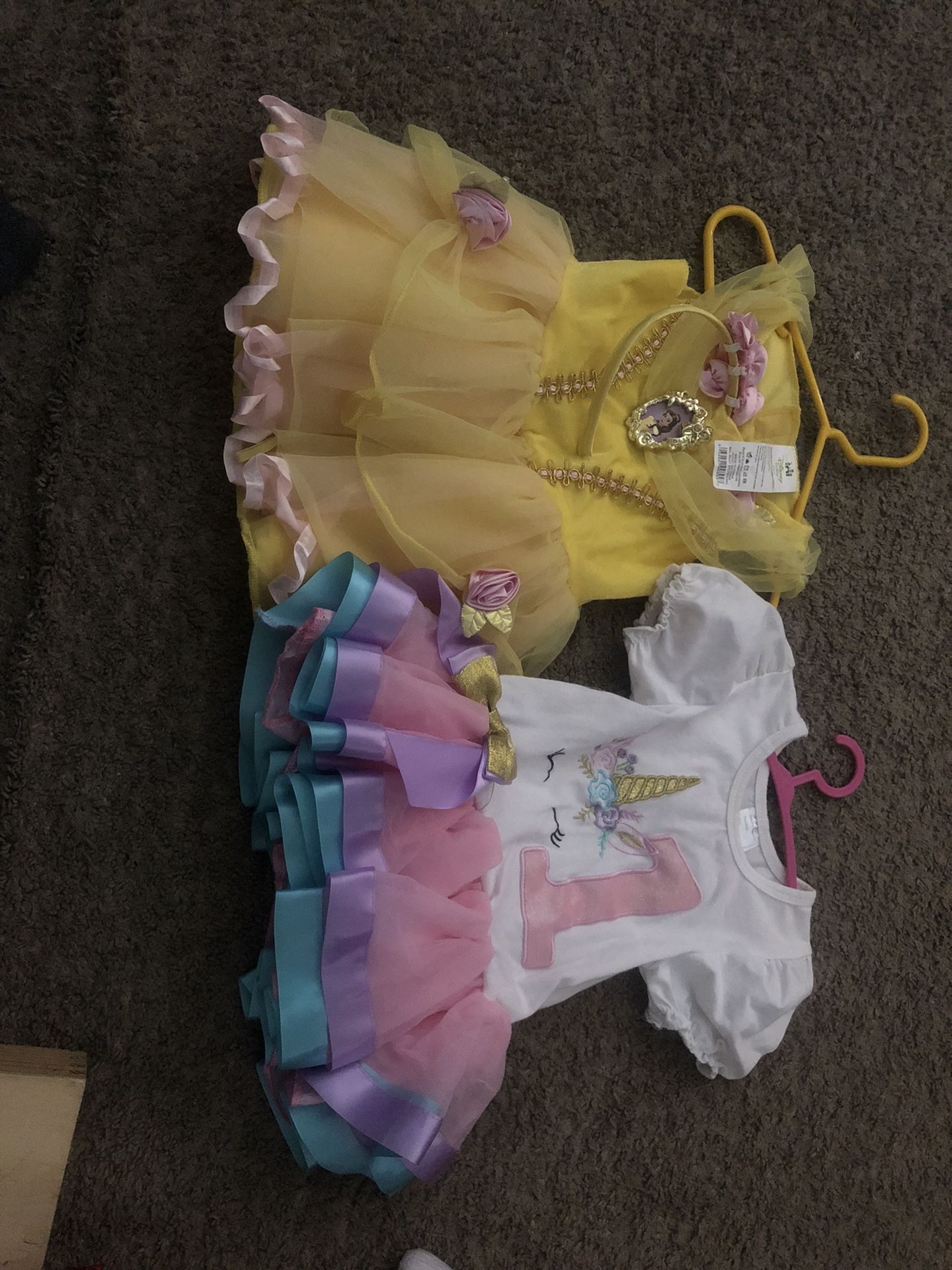 Great condition baby dresses Yellow is Disney baby 12-18 months with a headband Unicorn dress is S First birthday dress, Belle dress