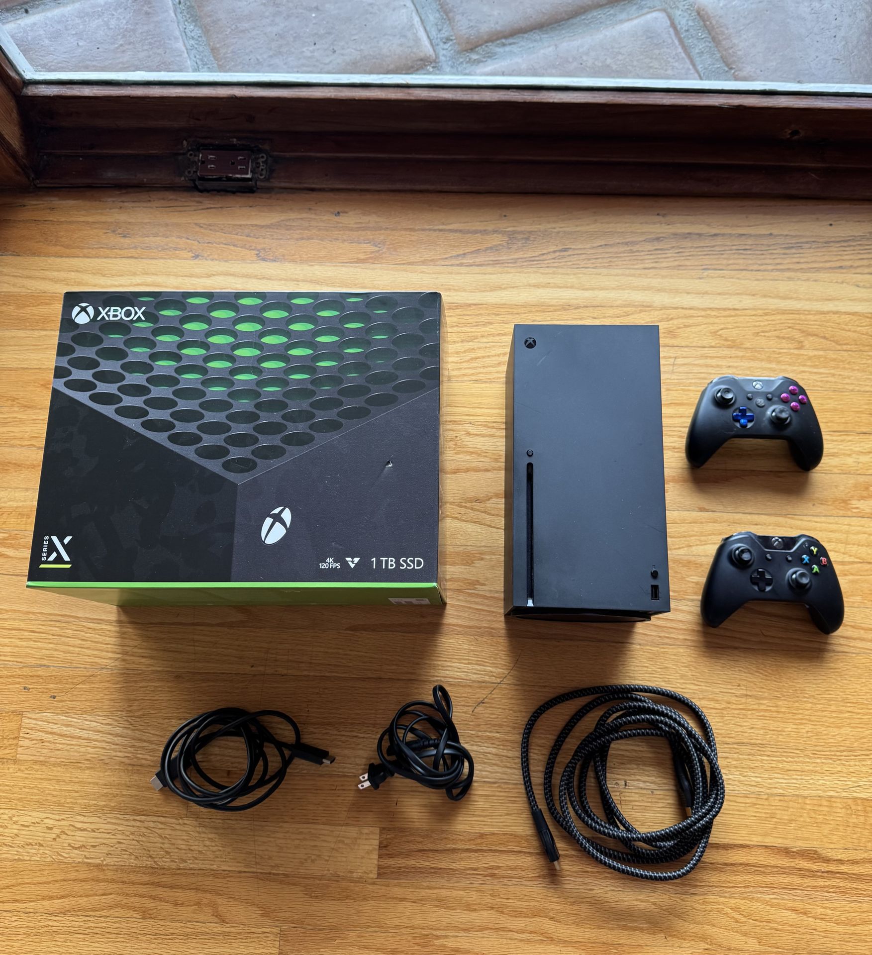 Xbox Series X 1TB Comes with original Xbox Series X 1TB Fully functional Console with original box (matching the serial#) on the console and box. Original power cord Original HDMI cable Additional HDMI long length 3.0 braided cable added for 240hz capability and monitor/TV reach. ** Original controller was given to a friend ** Comes with (2 controllers both do not have the back caps for the battery as they were lost on old Xbox I used to have but both controllers are “FULLY FUNCTIONAL” I will have a full setup available to test out to make sure you see it is fully functional. Condition is 10/10 mechanically Condition is 9.5/10 cosmetically Total hours use (no more than 45 hours max) Device will be reset on site once purchased. $260