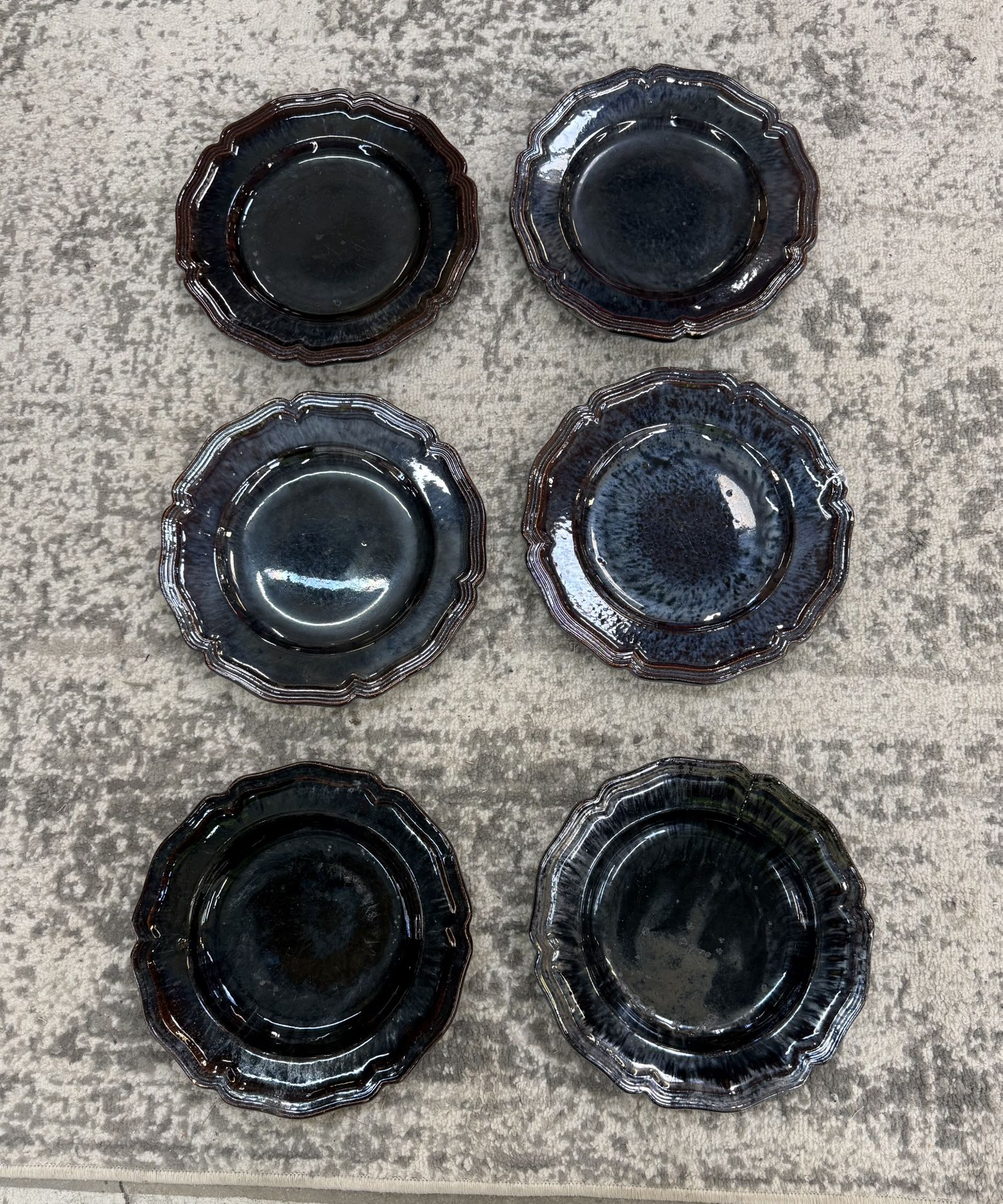 Set of 6 Antique French Dieulefit pottery plate w/reactive glaze & fluted rim