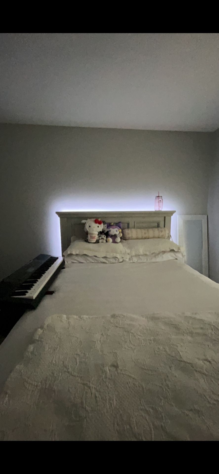 Grey woodstain Headboard/Bedframe/Footboard/Mirror and Dresser, Minor dents fits a full sized bed can negotiate price