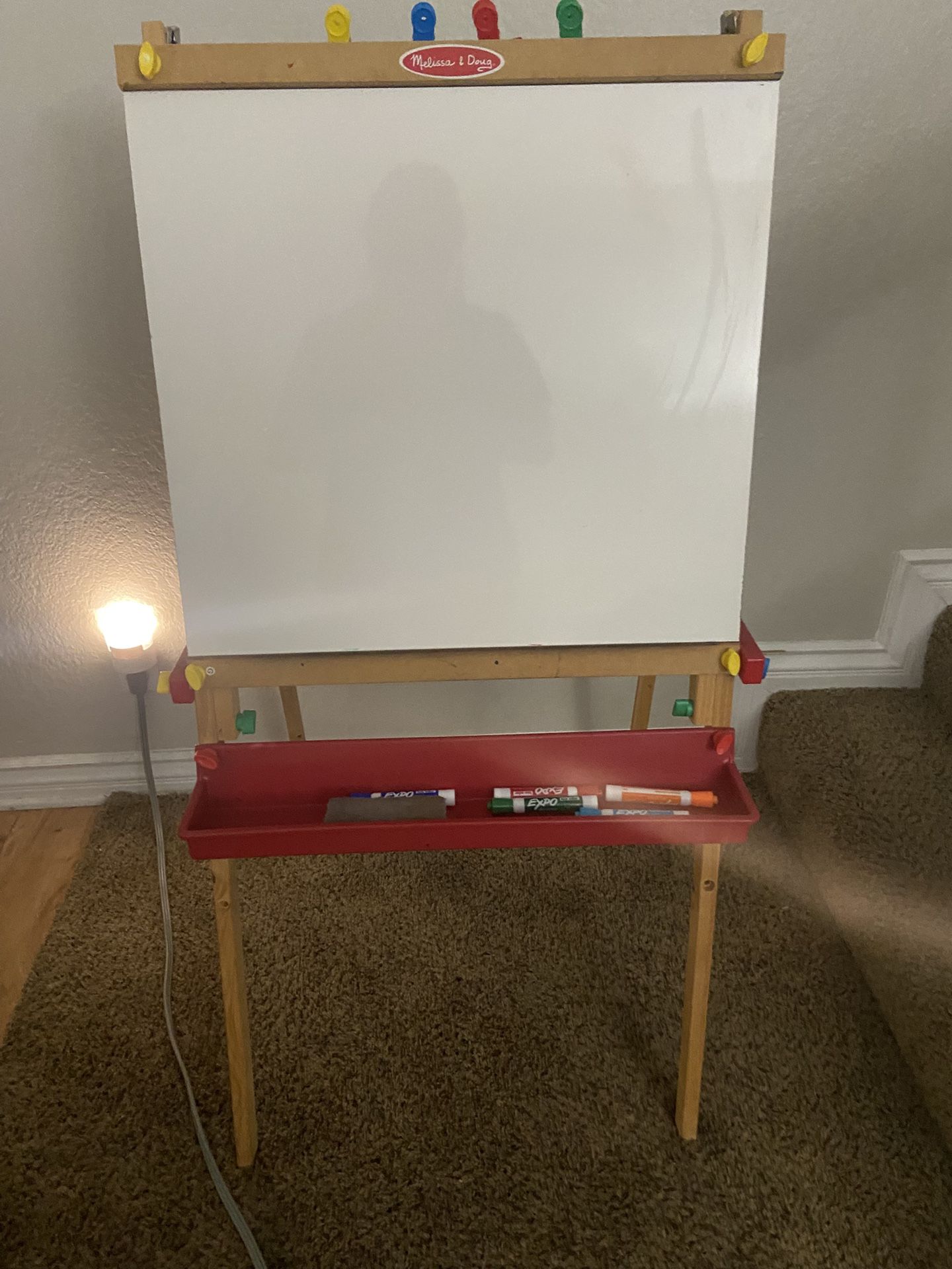 Comes with eraser and markers. Back is chalk board comes with chalk.