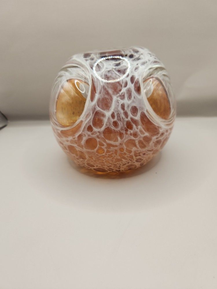 Handblown Amber and White Convex Window Fishbowl Candle Vase. Measures 5" in height. Very heavy and beautiful piece