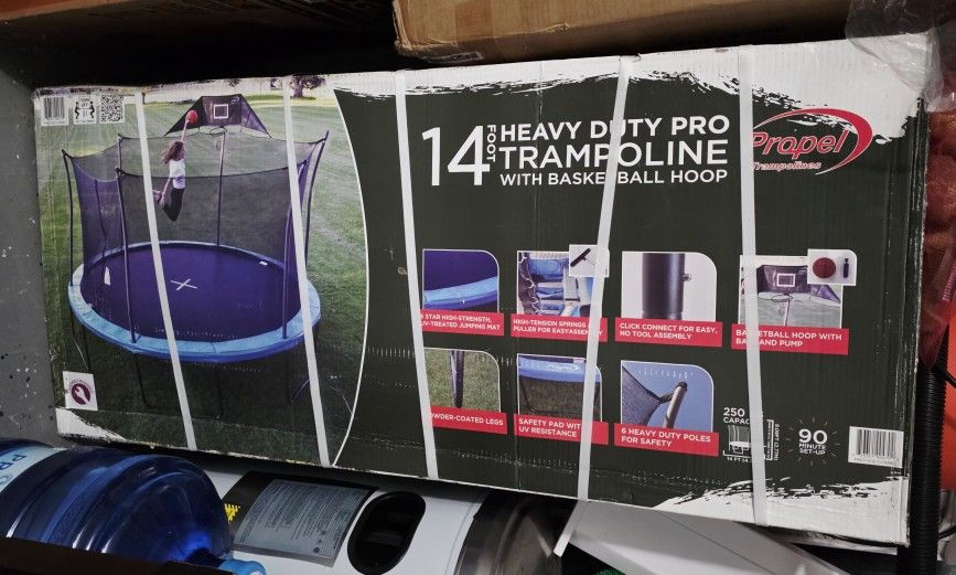 This is a Propel 14' Heavy-Duty Pro Trampoline with a basketball hoop. • The trampoline has a black, heavy-duty, powder-coated frame that is UV and rust- resistant. • It includes a safety enclosure and a basketball hoop with a ball and pump. • The trampoline has a weight capacity of 250 lbs.