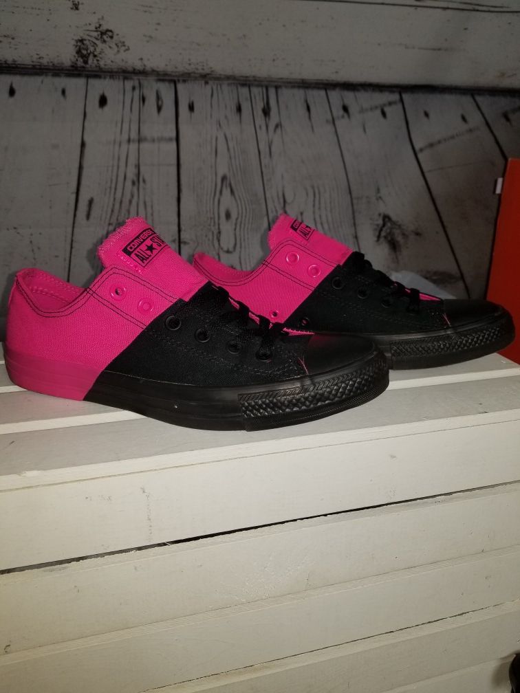 Here is a pair of unisex split color 2019 black and pink low top converse in nwot condition