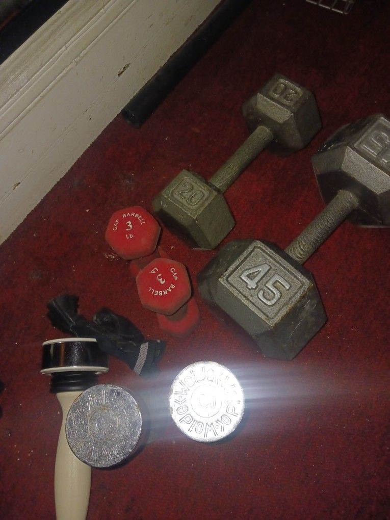 One 45lb one 20lb two 5lb etc. And two 3lb
