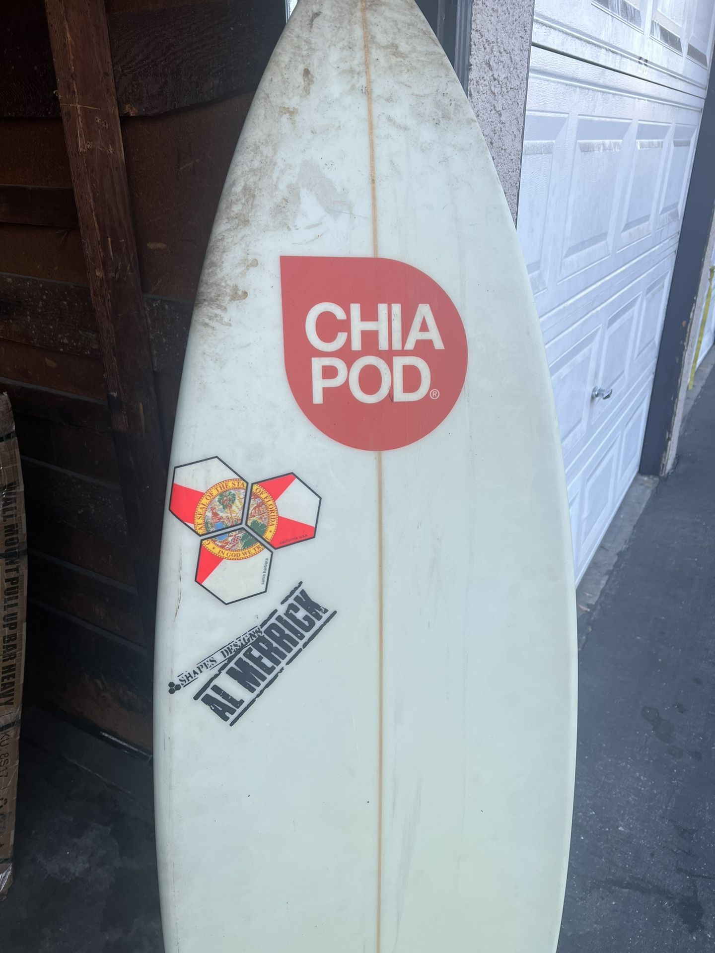 Chia Pod surfboard. Kelly replica Won it a long time ago and I’ve nvr used it. Pictures are pretty accurate. Been sitting in my garage since pre covid. I’ve had it since before that but I nvr got good enough to ride something that small. Cleaning out the garage and figured it could help pay for a new board No damage that I can see except a small dent which is visible in one of the pics. Dirty from my garage but in almost perfect condition. Measurements in one of the pics too. No cover or leash. Asking 200