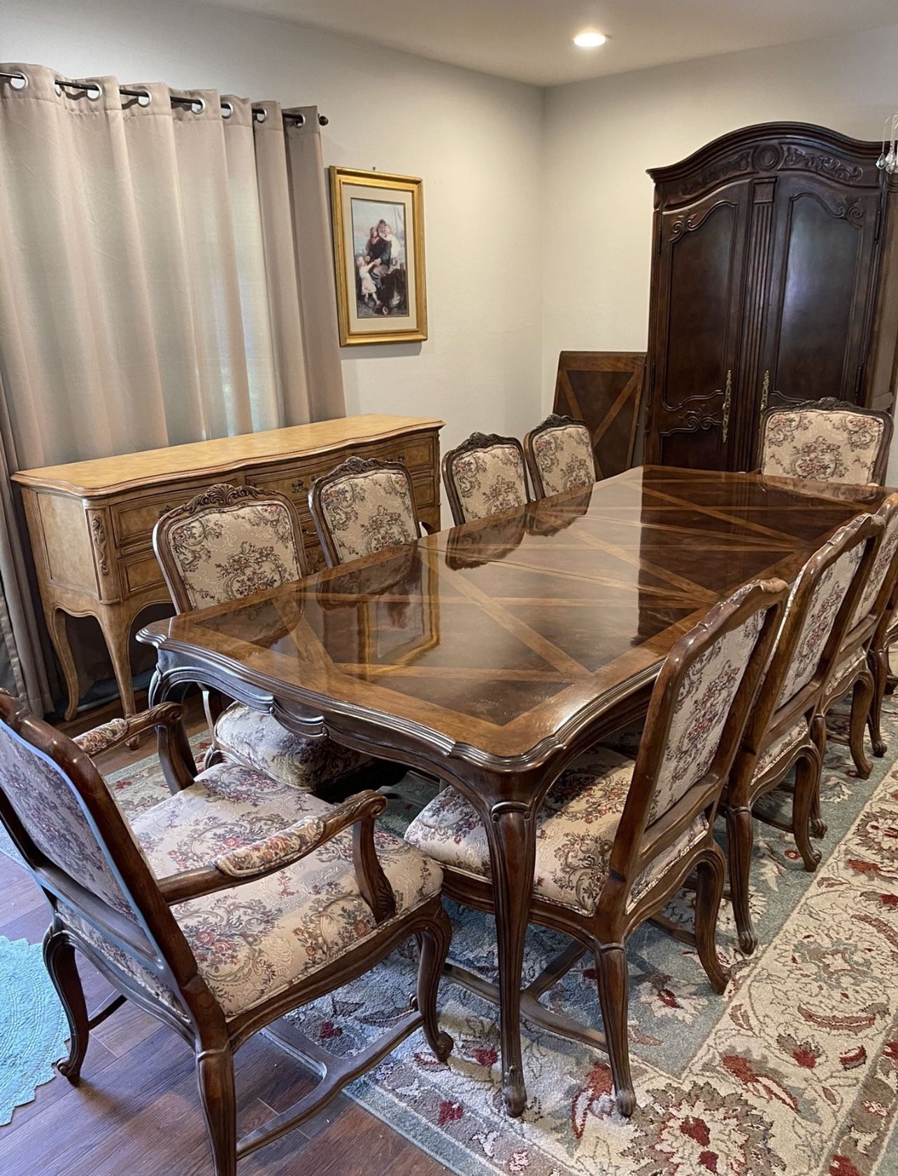 Large dining room table with 12 chairs and 3 leaf’s Picture shows table extended with only 1 of the leafs at 94.5” long with all 3 leafs it measures 140”. Like new in excel condition Chairs have been reupholstered Vintage piece they don’t make them like this anymore Must load Pick up in Claremont Price is $4500 Firm This is a steal for this table alone I’ve been original owner of this for over 30 years and table has always been covered with table padding
