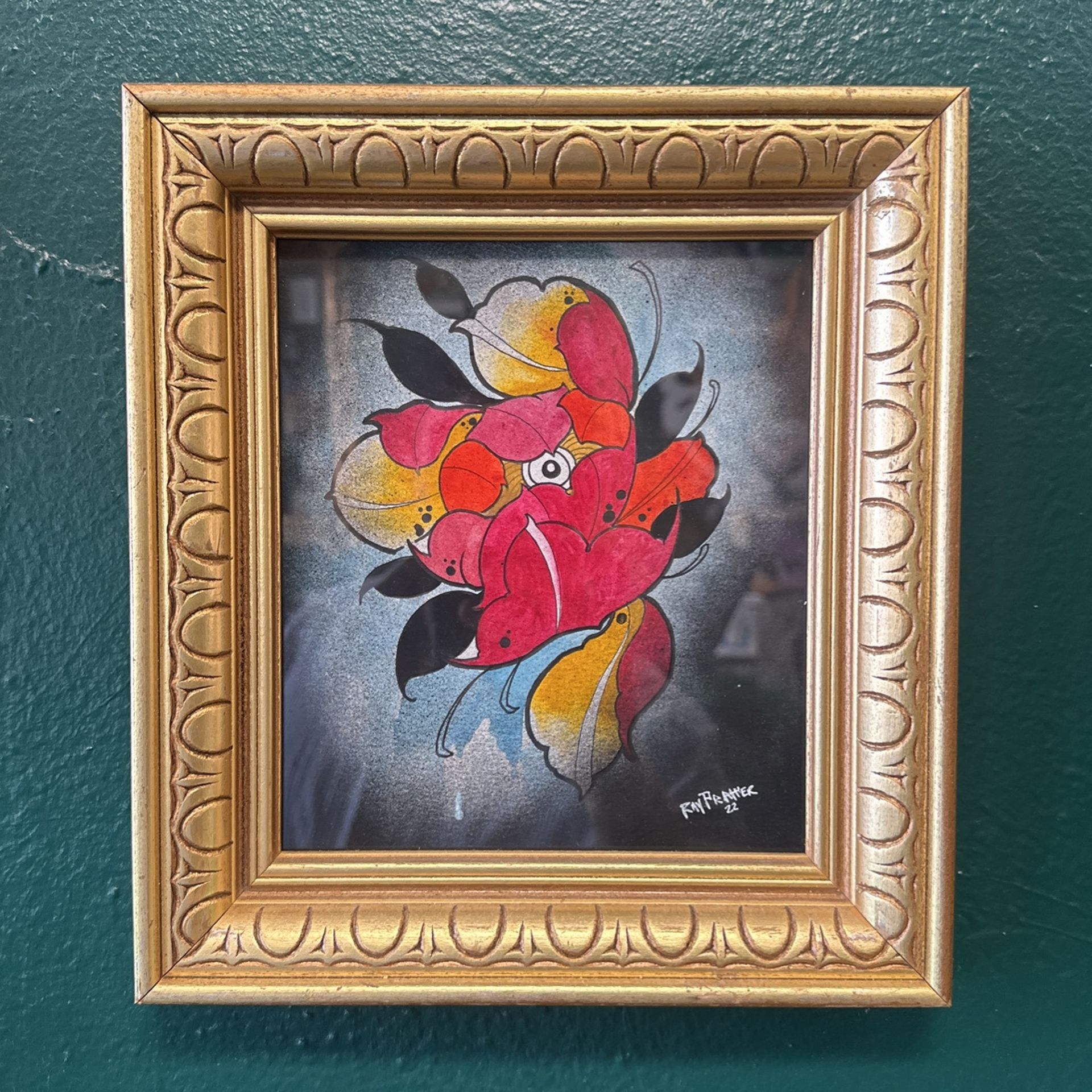 I painted this watercolor tattoo style flower comes with the frame 11inches x 10 I inches