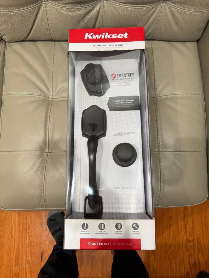 If the post is still active, the item is still available. Selling a brand new, unopened Kwikset Front Entry Combo Pack in matte black. This set includes both the keyed deadbolt and matching front door handle, featuring Kwikset’s SmartKey re-keying system. System Specs: Brand: Kwikset Style: Front Entry Combo Pack Finish: Matte Black Condition: Brand new, factory sealed Features: SmartKey Security (re-key yourself in seconds) Bump proof and pick resistant One-tool installation Fits all standard doors Certified security and durability Includes: Deadbolt, handle, keys, installation hardware Perfect for front doors, home upgrades, rentals, or remodels. Stylish, secure, and super easy to install. Price: $40 (Cash App, Venmo, Cash). No trades.