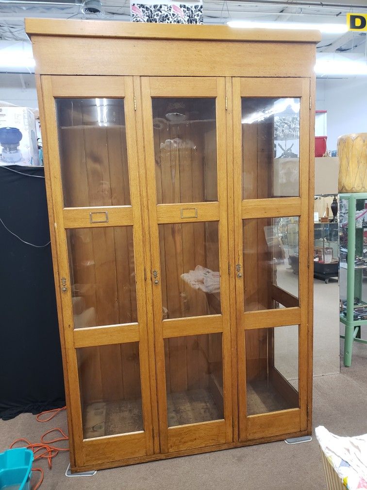 Rare 3 door museum quality mannequin display case. 27"d x 96"h x 69"w. The case is in excellent condition for its age C1910. All the glass is good. The item is for sale at the Main St Antique Mall in Mesa, booth D5. The mall is located in the Sun Valley Plaza at 7260 E. Main St., Mesa, AZ, 85207. Hours are 10-5:30 daily. Cross streets are Power Rd. and Main St.