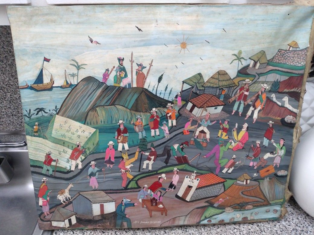 Rare Paint Made On Animal Skin- Latinamerican Town Scene 19" x 21" signed