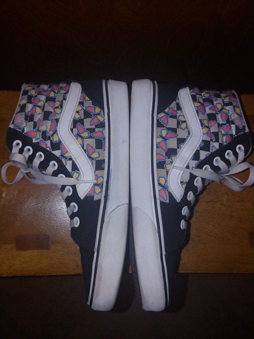 VANS WOMENS FILMORE High Top Sneaker, black & white check with butterflies. Size 7.5