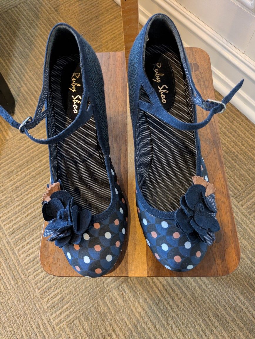 Worn only once! Part navy suede, part polka dot matte satin. Retro style! Very cute.