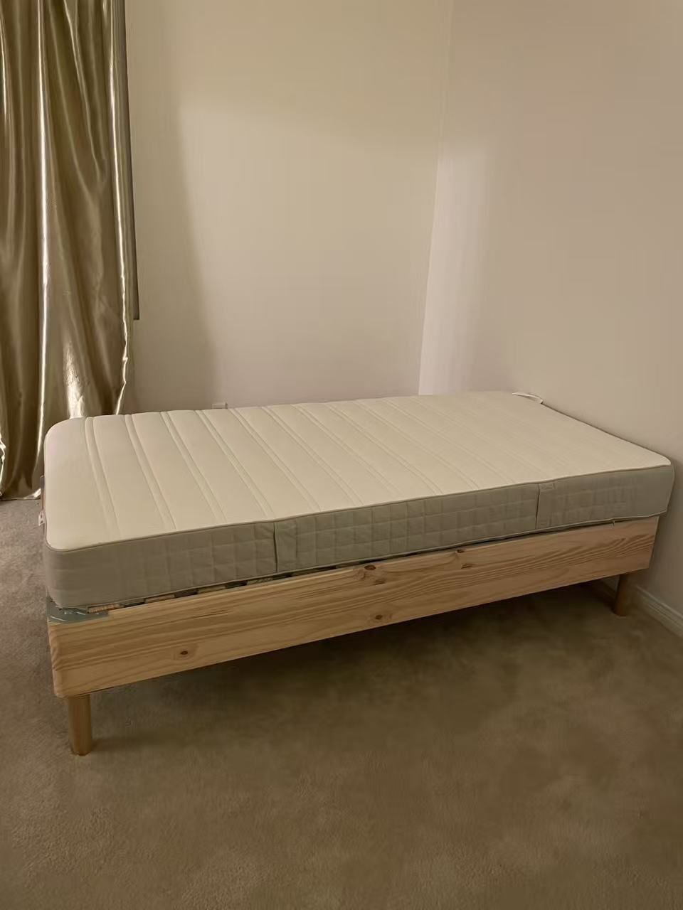 Including the solid wood bed frame and the matching twin mattress. It was used for only 2 days by a guest, so it's in almost brand-new condition — clean, firm. Perfect for a guest room, kids’ room, rental, or extra sleeping setup. • Includes solid pine twin bed frame • Includes twin mattress (very clean) • Modern, simple Scandinavian design • Sturdy and lightweight • No stains, no odors, no sagging • Smoke-free and Pet-free home 📍 Pickup only