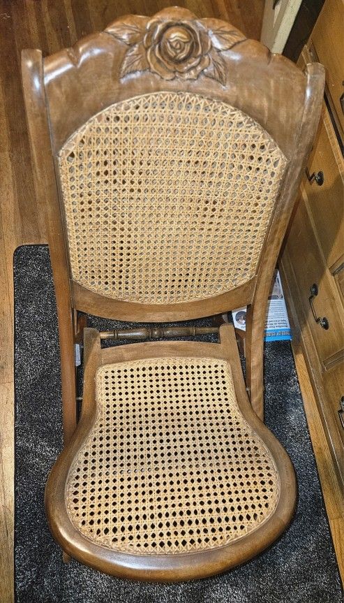 Vintage victorian style beautiful folding rocking chair It is constructed of solid wood with a woven cane seat and back. Good condition structurally. The chair is in great shape some of light surface scratches, height is 33” inches Chair length is 32” Chair width is 19” Seat depth is 14” Seat height is 24” Backrest height is 24” Great antique conditions. 120.00 dlls obo