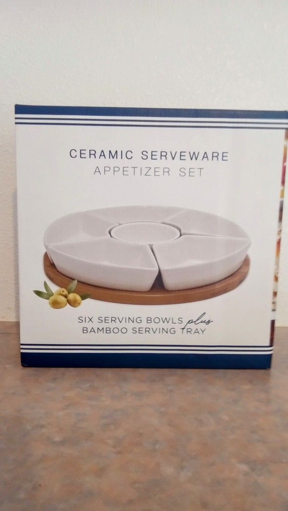 Bamboo serving tray has a functional and ergonomic design to help secure each dish and place an aid in creating an appetizing and smooth serving from kitchen to table. Six ceramic dishes are safe for both the dishwasher and microwave.