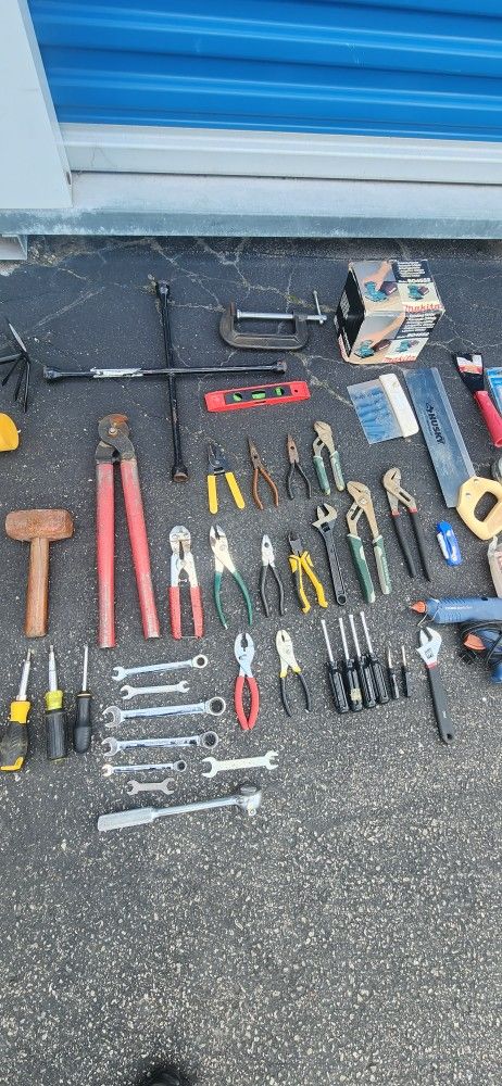 Selling a large variety of tools β perfect for DIY projects, mechanics, carpenters, or anyone looking to build their tool collection. π§ Included in the Lot: πΉ Striking & Cutting Tools: Sledge hammer Rubber mallet Hatchet/axe (2 types) Hand saw (Husky miter back saw) Crowbars / pry bars (2 sizes) πΉ Pliers & Grip Tools: Bolt cutters Multiple pliers: slip joint, needle-nose, wire cutters, locking pliers (Vise-Grips), channel locks Wire strippers & crimpers πΉ Wrenches & Ratchets: Combination wrenches (metric & SAE) Ratcheting wrenches Adjustable wrench Ratchet with extension πΉ Screwdrivers & Hex Keys: Flathead & Phillips screwdrivers (various sizes) Precision screwdrivers Hex/Allen key sets (standard & folding types) πΉ Measuring & Leveling: 3 measuring tapes (Stanley & others) Level (spirit level) πΉ Clamps & Specialty Tools: Metal C-clamps (2 sizes) Tire iron (cross wrench) Putty knives / scrapers Gardening hand rake tool (new) πΉ Power/Utility Items: Glue gun Utility knife (new in package) Makita sander (with box) πΉ Misc Items: Safety goggles Tape measures extended to show accuracy Extra handles, accessories & small part β Great For: β Home improvement β Automotive work β Carpentry / construction β DIY projects & general repairs β Starting a tool collection or reselling Price $120 for everything β open to reasonable offers. Cash or Zelle only. π Pickup Only